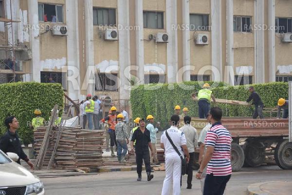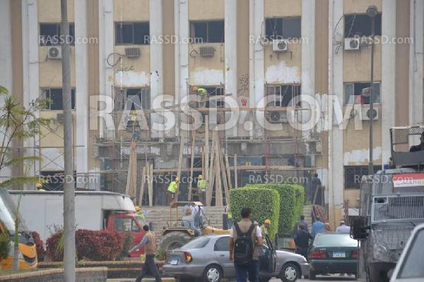 و يقوم العمال بإزالة التشوهات التى حدثت بالمبنى، وتجديد الواجهة الرئيسية له .