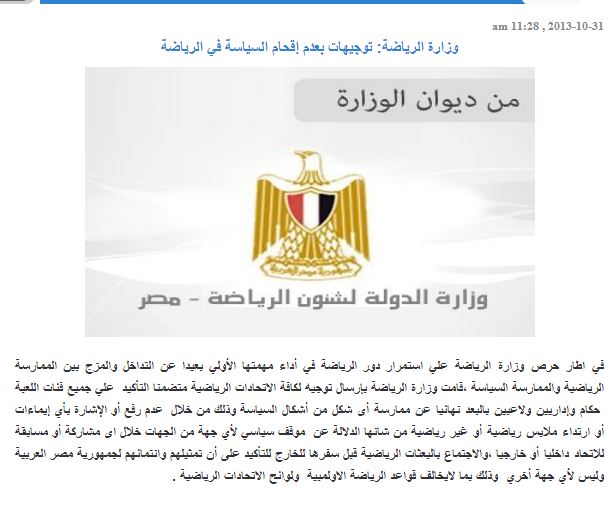 وقالت عبرموقعها الرسمي على شبكة "الانترنت" أنه " في إطار حرص وزارة الرياضة على استمرار دور الرياضة في أداء مهمتها الأولي بعيدا عن التداخل والمزج بين الممارسة الرياضية والممارسة السياسة، قامت وزارة الرياضة بإرسال توجيه لكافة الاتحادات الرياضية متضمنا التأكيد علي جميع فئات اللعبة حكام وإداريين ولاعبين بالبعد نهائيا عن ممارسة أى شكل من أشكال السياسة"