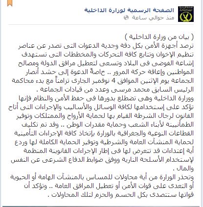 وجاء هذا التهديد عبر صفحة الوزارة الرسمية على موقع التواصل الاجتماعي "الفيس بوك" في بيان رسمي أشار إلى أن القوات الانقلابية سوف تستخدم الأسلحة النارية وفق ما أطلقت عليه " ضوابط الدفاع الشرعي عن النفس والمال" وحسبما قالت أنه سيكون "في إطار الإجراءات القانوينة المنظمة لإستخدام الأسلحة النارية"، مؤكدا على أن قواته الانقلابية سوف تتصدى بكل "الحسم والحزم لتلك المحاولات "