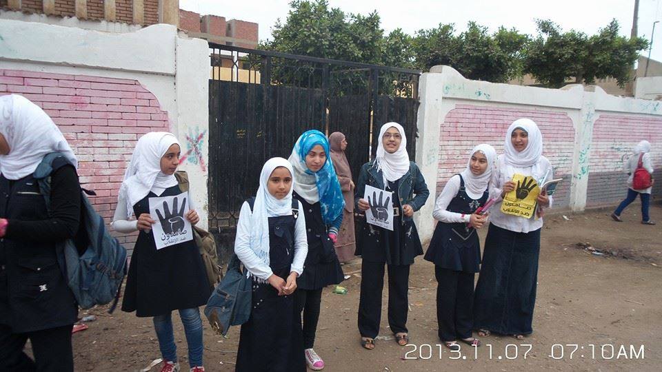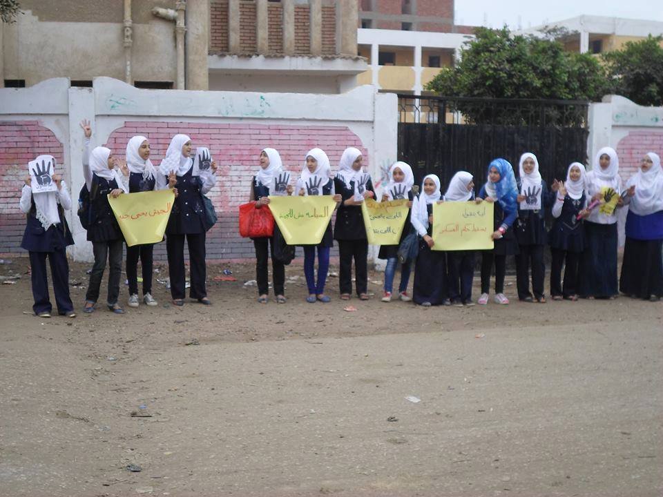 وقد رفع الطالبات شعار النصر رابعة العدوية ولافتات تندد بالانقلاب .