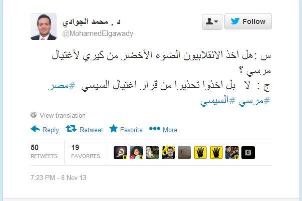 تساءل د. محمد الجوادي-المحلل والمؤرخ السياسي- في تدوينه له على صفحته الشخصية على موقع "تويتر:"هل أخذ الانقلابيون الضوء الأخضر من جون كيري-وزير خارجية أمريكا- لاغتيال مرسي ؟