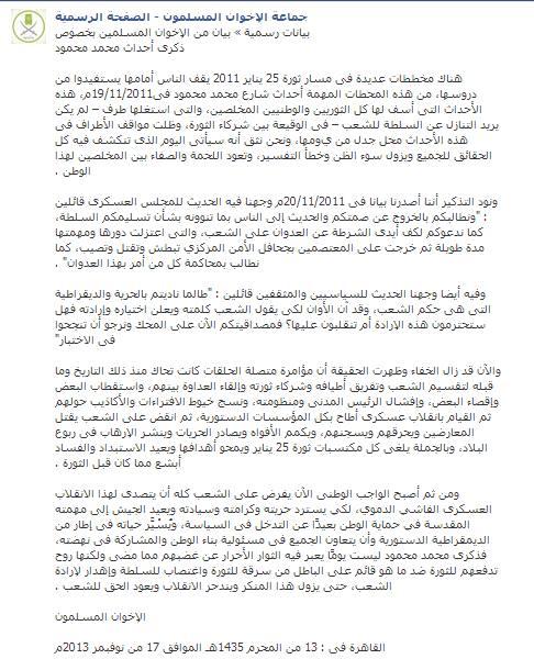 أصدرت جماعة الإخوان المسلمين بيانا اليوم بمناسبة ذكري أحدث محمد محمود أشارت فيه إلى أنها أحداث يجب الوقوف عليها للاستفادة من دروسها خاصة بعد أن تكشفت مؤامرة المجلس العسكري للوقيعة بين شركاء ثورة الخامس والعشرين من يناير (حسب قولها).