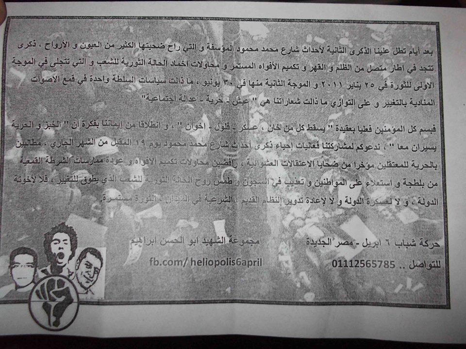 وورد في هذا المنشور أنه "بعد أيام تطل علينا الذكرى الثانية لأحداث شارع محمد محمود المؤسفة والتى راح ضحيتها الكثير من العيون والارواح .. ذكرى تجدد فى إطار متصل من الظلم والقهر وتكميم الأفواه المستمر ومحاولات إخماد الحالة الثورية للشعب، والتي تتجلى فى الموجة الأولى للثورة فى 25 يناير 2011."