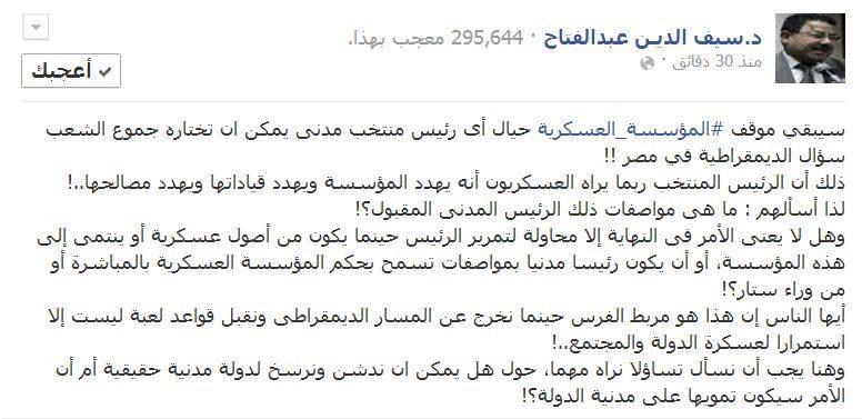 وتسائل د.عبد الفتح :"ما هى مواصفات ذلك الرئيس المدنى المقبول؟! وهل لا يعنى الأمر فى النهاية إلا محاولة لتمرير الرئيس حينما يكون من أصول عسكرية أو ينتمى إلى هذه المؤسسة، أو أن يكون رئيسا مدنيا بمواصفات تسمح بحكم المؤسسة العسكرية بالمباشرة أو من وراء ستار؟!".