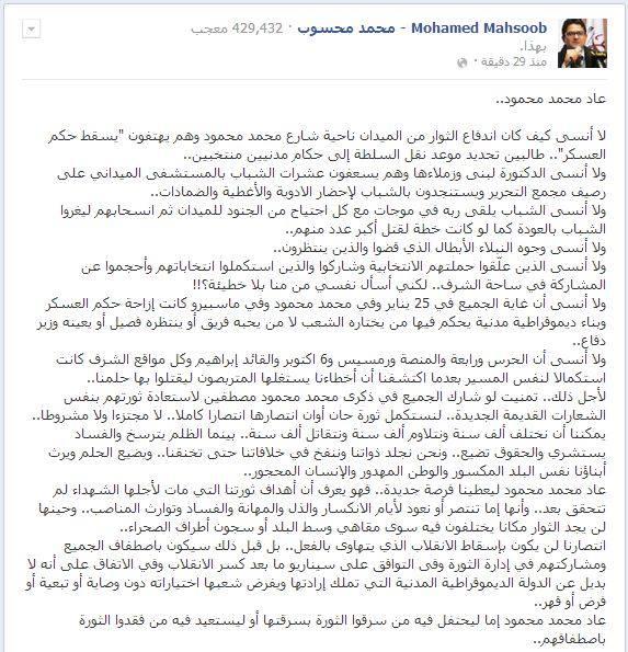 وأوضح:"لا أنسى أن غاية الجميع في 25 يناير وفي محمد محمود وفي ماسبيرو كانت إزاحة حكم العسكر وبناء ديموقراطية مدنية يحكم فيها من يختاره الشعب لا من يحبه فريق أو ينتظره فصيل أو يعينه وزير دفاع.".