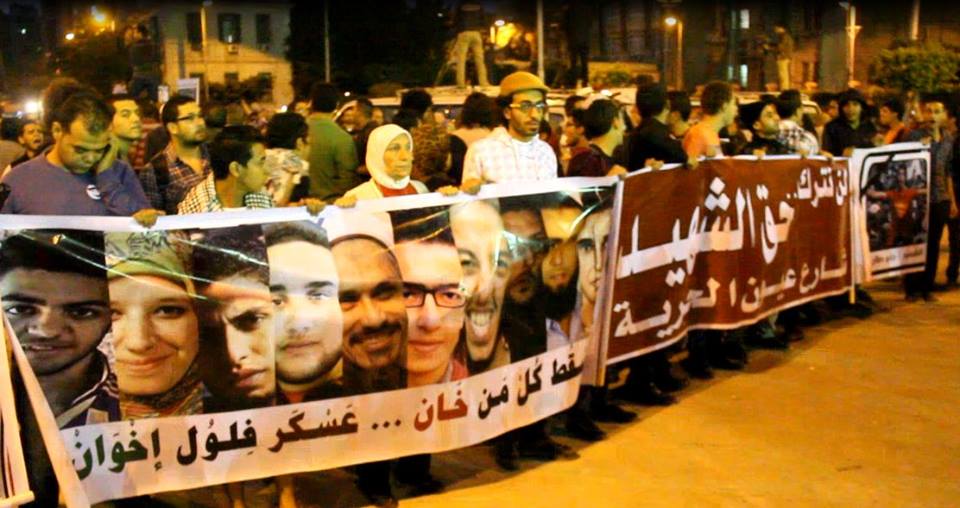 و حمل المتظاهرون علم الشهيد "جيكا" ولافتات أخرى عليها صورعدد من الشهداء، مكتوب علي بعضها "يسقط كل من خان ..عسكر..فلول ..اخوان " , ولافتة أخرى مكتوب عليها "لن ترك حق الشهيد..شارع عيون الحرية " .