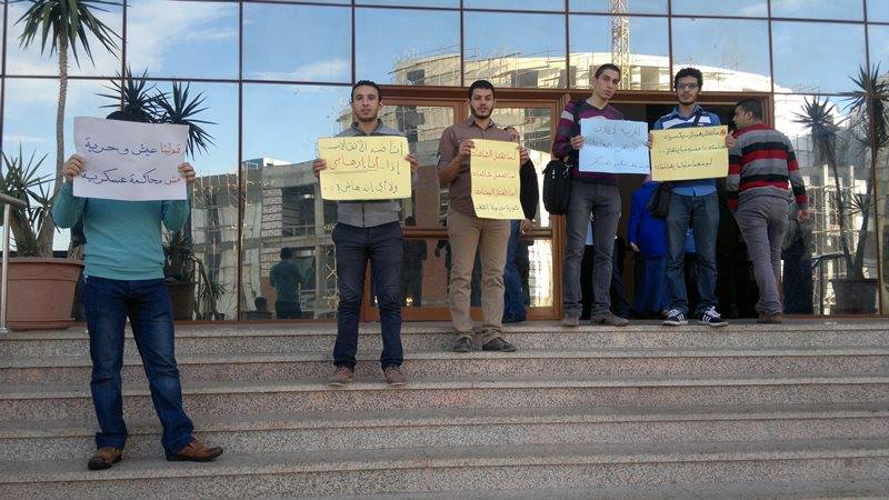 وردد الطلاب هتافات (يسقط يسقط حكم العسكر) و(الانقلاب هو الارهاب) وسط تفاعل ومشاركة من باقي الطلبة والمواطنيين مع هذه الوقفة.