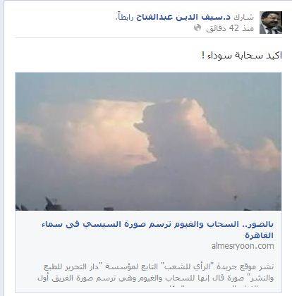 وكتب د. سيف عبد الفتح يقول : "بمناسبة البوست الأخير …إن شاء الله سيكون السيسي مجرد سحابة وهتعدي ".