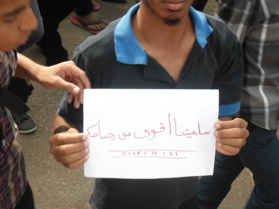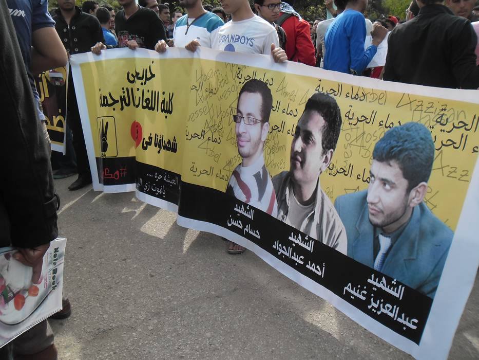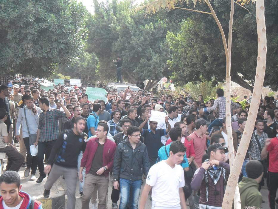 نظم طلاب جامعة الأزهر مسيرة حاشدة داخل الحرم الجامعي بمدينة نصر تنديدا باستشهاد طالبين داخل المدينة الجامعية بعد إصابتهم بطلقات خرطوش من قبل قوات الأمن أثناء فضها تظاهرة لهم بالقوة المفرطة أمس أمام المدينة الجامعية.