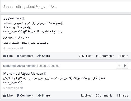دشن عدد من رافضى الانقلاب العسكري  على موقع التواصل الاجتماعي فيس بوك " اليوم الخميس , هاشتاج "الصندوق خيانة "  جاء ذلك ردا على مبادرة الدكتور محمد على بشر عضو التحالف الوطني بطرح استفتتاء حول خارطة طريق الفريقاول عبد الفتاح السيسي وخارطة طريق الرئيس محمد مرسي و القبول بنتيجة الاستفتاء أيا كانت .