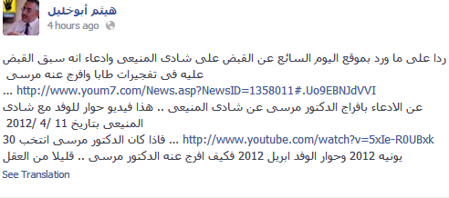 وصف الحقوقي المصري هيثم أبو خليل ما نشرته صحيفة اليوم السابع عن أن الرئيس مرسي أفرج عن شادي المنيعي الذي تتهمه سلطات الانقلاب بقاتل ضابط الأمن الوطني محمد مبروك بالادعاءات.