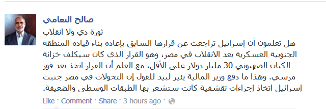قال صالح النعامي –الباحث في شئون الكيان الصهيوني – "هل تعلمون أن إسرائيل تراجعت عن قرارها السابق بإعادة بناء قيادة المنطقة الجنوبية العسكرية – كتعزيزات عسكرية لأمنها-  بعد الانقلاب في مصر؟" .