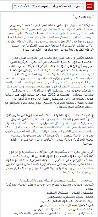 وجاء بالبيان " قررنا نحن تمرد –الاسكندرية حل الحركة بالاسكندرية و الرجوع كما كنا فى صفوف الشعب و الثوار عاملين على استكمال أهداف الثورة و نعلن أن قرارات اللجنة المركزية لا تمثلنا و تتحول صفحة تمرد اسكندريه إلى صفحه ثورية فقط تعمل على تحقيق مطالب 25 يناير و موجاتها وصولا إلى 30 يونيو و ان اى قرار يصدر عن مركزيه تمرد لا يمثلنا