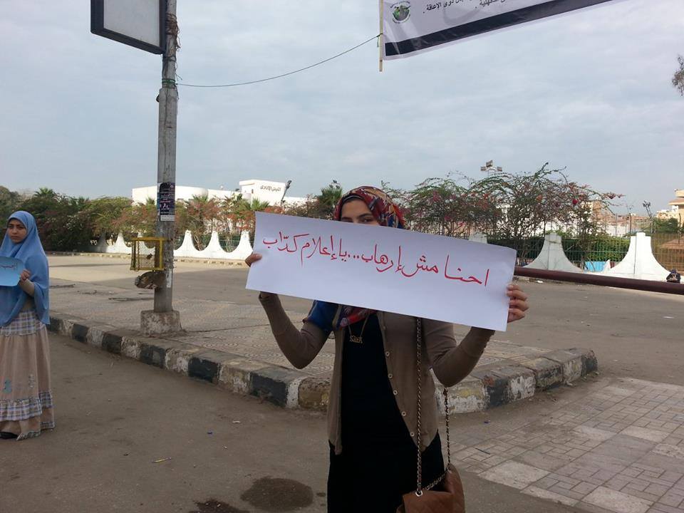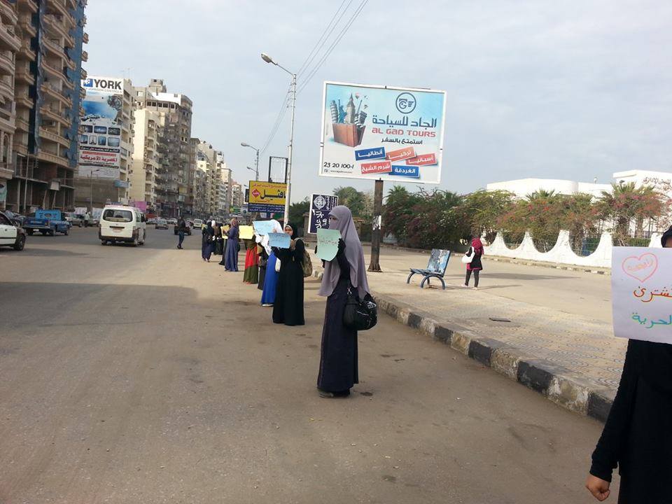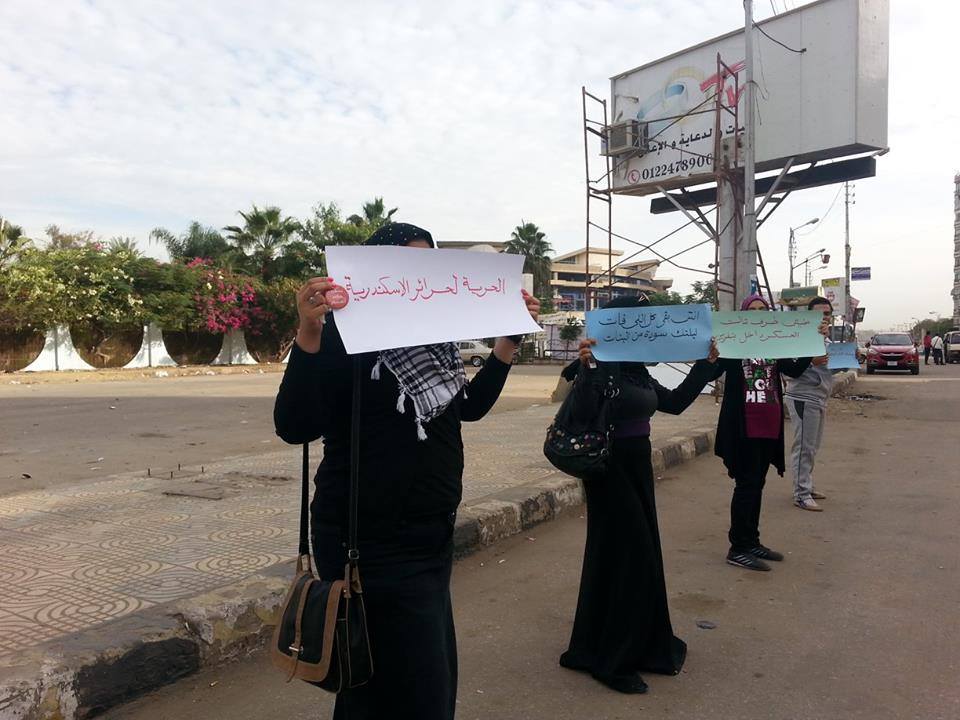 ورفعت المشاركات لافتات مكتوب علي بعضها :"قولوا لهم رغم المحن لن ارتدى ثوب الوهن" , "فينك يا مرسي فينك حبسوا بناتنا عيني عينك" , "إحنا مش ارهاب يا اعلام كداب" , "الحرية لحرائر الاسكندرية".