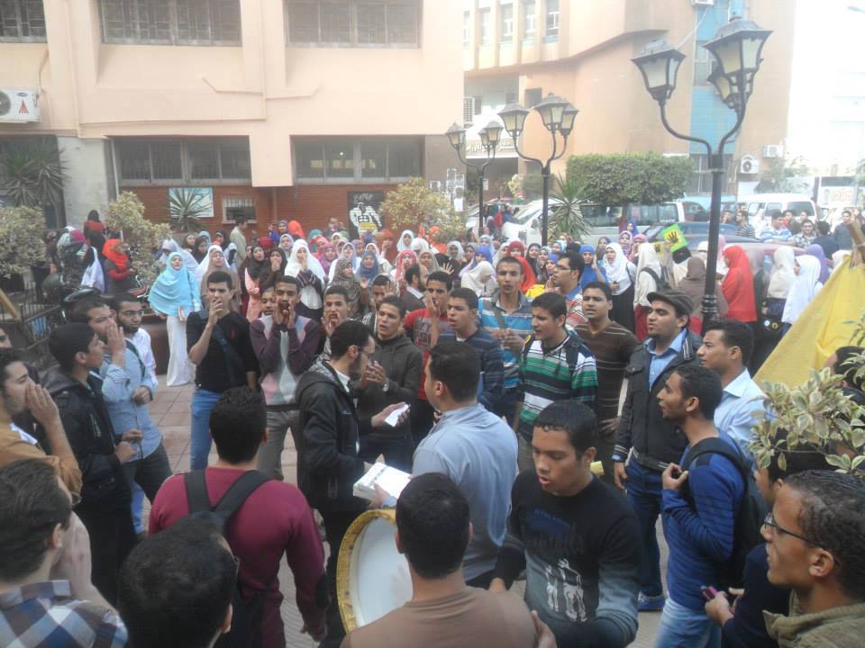 ورددوا هتافات منها: "مصطفى يا ولد سجنك بيحرر بلد"، في إشارة إلى زميلهم الذي تم حبسه 4 سنوات، احلق شنبك والبس جيبة حبسوا اخواتنا فى التخشيبة يسقط يسقط حكم العسكر إحنا الطلبة الخط الأحمر", اكتب على سور الزنزانة حبس وقتل الطلبة عار وخيانة", "الداخلية بلطجية ", "اقتل واحد اسجن ميه مش هتنسينا القضية", "القانون دا عند أمك", "الطلاب قالوها قوية مرسي رئيس ومعاه شرعية" "إحنا الطلبة ودي كلمتنا يرجع مرسي نرجع بيتنا".
