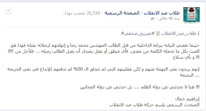 أكد طلاب ضد الانقلاب أنه "حينما تقضي النيابة ببراءة الداخلية من قتل الطالب المهندس محمد رضا و إتهامهم لزملائه بقتله فهذا هو العبث بكل ما تحمله الكلمة من معنى, فأي منطق أو عقل يصدق أن يقتل الطالب زميله … فلأجل من ؟!!! و بأي سلاح !!!"