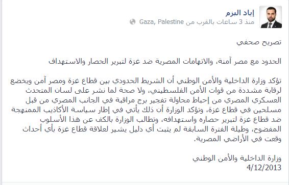 صرح مدير المكتب الإعلامي بوزارة الداخلية الفلسطينية بحكومة حماس إياد البزم أن "الحدود مع مصر آمنة، والاتهامات المصرية ضد غزة لتبرير الحصار والاستهداف"