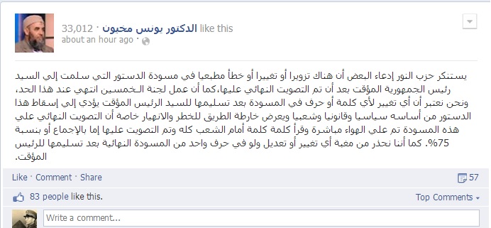 وأضاف بيان من الحزب نشرته الصفحة الرسمية للدكتور يونس مخيون:" ونحن نعتبر أن أي تغيير لأي كلمة أو حرف في المسودة بعد تسليمها للسيد الرئيس المؤقت يؤدي إلي إسقاط هذا الدستور من أساسه سياسيا وقانونيا وشعبيا ويعرض خارطة الطريق للخطر والانهيار خاصة أن التصويت النهائي علي هذه المسودة تم علي الهواء مباشرة وقرأ كلمة كلمة أمام الشعب كله وتم التصويت عليها إما بالإجماع أو بنسبة 75%. كما أننا نحذر من مغبة أي تغيير أو تعديل ولو في حرف واحد من المسودة النهائية بعد تسليمها للرئيس المؤقت".