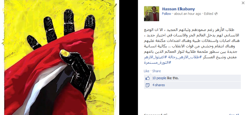 وقال في تدوينة علي صفحته علي موقع التواصل الاجتماعي "فيس بوك ": طلاب الأزهر رغم صمودهم وثباتهم المجيد ، إلا أن الوضع الانساني لهم يدخل العالم الحر والإنسان في اختبار جديد ، هناك اصابات واستغاثات طبية وهناك اعتداءات مكثفة عليهم وهناك انتقام وحشي من قوات الانقلاب .. بكائية انسانية جديدة بين سطور ملحمة طلابية لثوار العمائم الذين باعهم مفتي وشيخ العسكر ".
