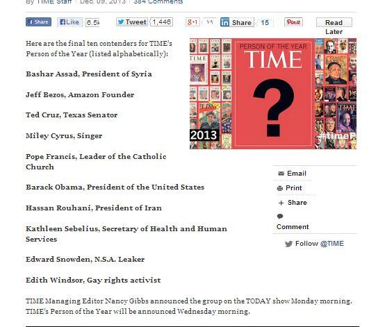 أكدت مجلة تايم الأمريكية  خروج وزير الدفاع المصري عبد الفتاح السيسي ورئيس الوزراء التركي رجب طيب أردوغان رغم أن الاثنين حازوا على المركز الاول والثاني للتصويت  من القائمة مبررة في وقت سابق أنه بسبب حشد التصويت الموجه من بعض وسائل الاعلام .
