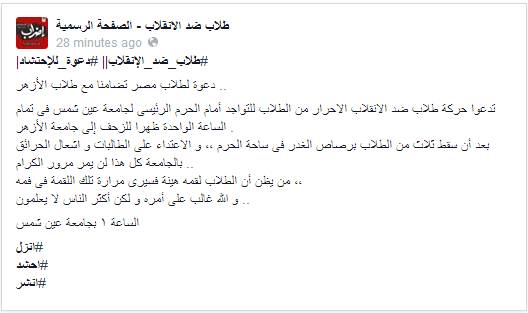 وقالت صفحة طلاب ضد الانقلاب في بيانها على موقع التواصل الاجتماعي "فيس بوك": " تدعوا حركة طلاب ضد الانقلاب الأحرار من الطلاب للتواجد أمام الحرم الرئيسي لجامعة عين شمس فى تمام الساعة الواحدة ظهرا للزحف إلى جامعة الأزهر".