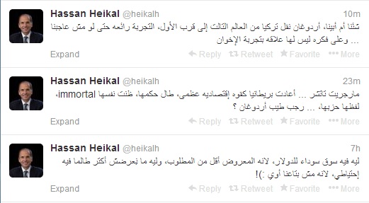وقال هيكل على حسابه الرسمي: "شئنا أم أبينا، أردوغان نقل تركيا من العالم الثالث إلى قرب الأول، التجربة رائعة حتى لو مش عاجبنا … وعلى فكره ليس لها علاقه بتجربة الإخوان, الإيحاء بالانضمام للاتحاد الأوربي ساعدت تركيا، و لكن يبقى أنه نقل البلد من الإفلاس إلى القوه ال١٥ اقتصادياً".