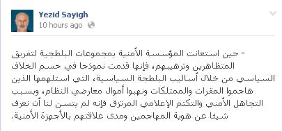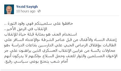 قال يزيد الصايغ – باحث رئيسي بمعهد كارينجي للشرق الأوسط – إن استخدام العنف هو بمثابة قبلة حياة للإنقلاب فإعتقال النساء و الأطفال من قبل الشرطة ،والإعتداء السافر علي الطالبات ،وإطلاق الرصاص الحي علي الدارسين بقاعات الدراسة, هو محاولات يائسة من عرابين الإنقلاب العسكري الذين يراهنون علي جر الإخوان المسلمين والثوار للعنف ،ولكنهم لا يدركون أنهم أمام شعب يتمتع بوعي سياسي رفيع.
