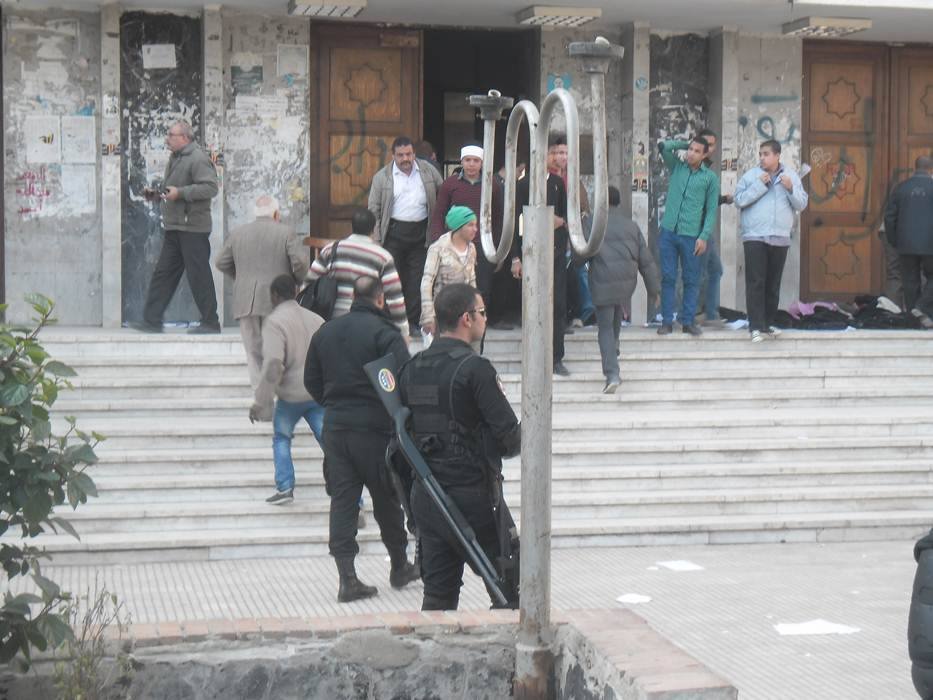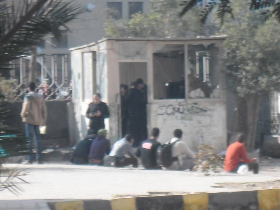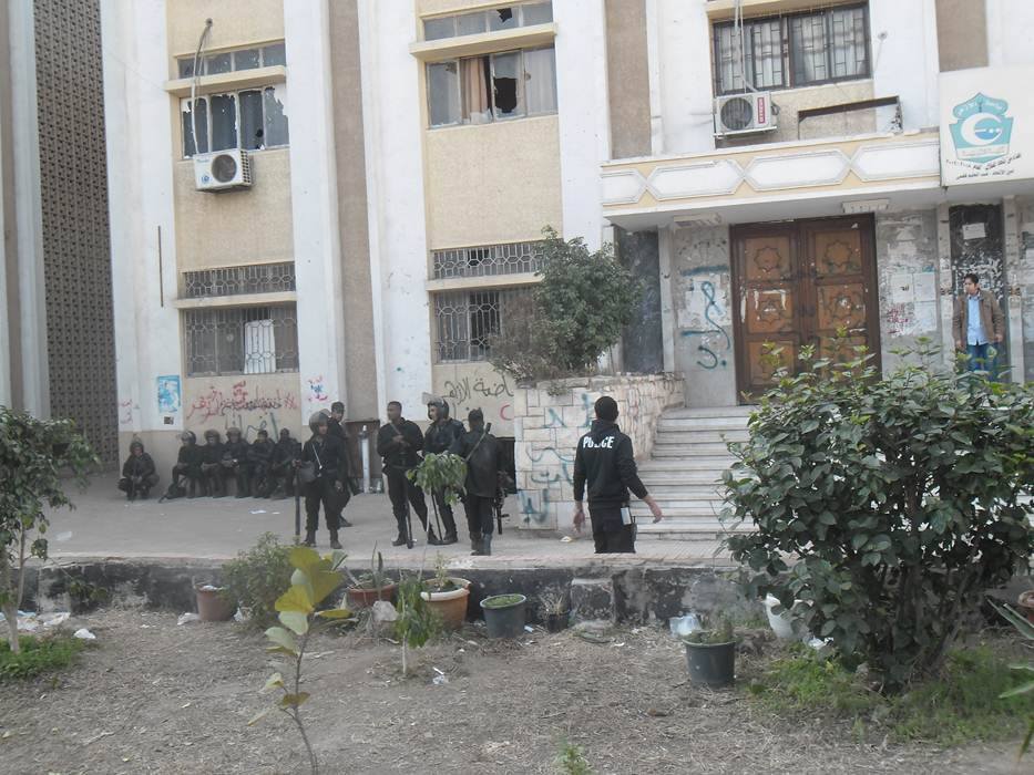 و فرض الأمن سيطرته على كلية التربية مدعم بعشرات الجنود من الأمن المركزى وفض الشغب والعمليات الخاصة مسلحين بالعصى وقنابل الغاز والخرطوش.