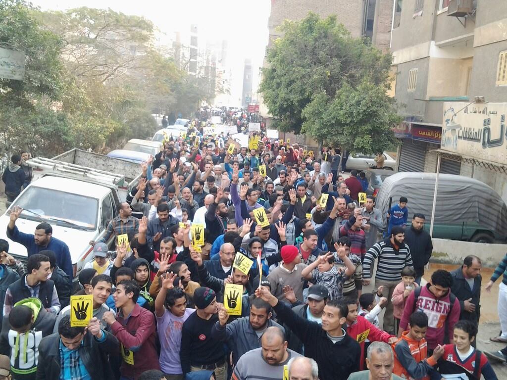 وجابت المسيرة الشوراع متجهة إلى كورنيس النيل بحلوان ،رفع المشاركون شارات رابعة العدوية وصور للشهداء ،كما طالبوا بمقاطعة الإستفتاء على وثيقة الدستور نصرة لدماء الشهداء .