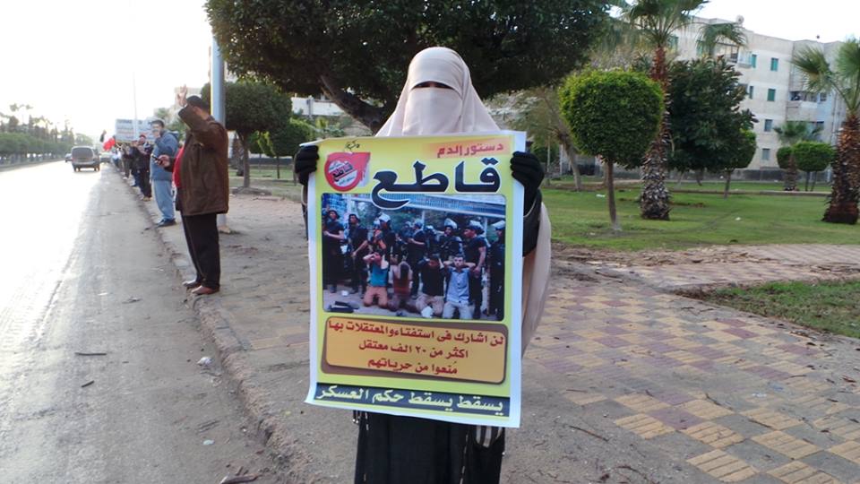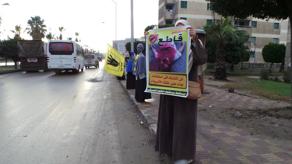 ورفع المشاركون في السلسلة البشرية شارات رابعة العدوية، و صور الرئيس محمد مرسي، ولافتات تناشد الشعب بمقاطعة الإستفتاء على الدستور.