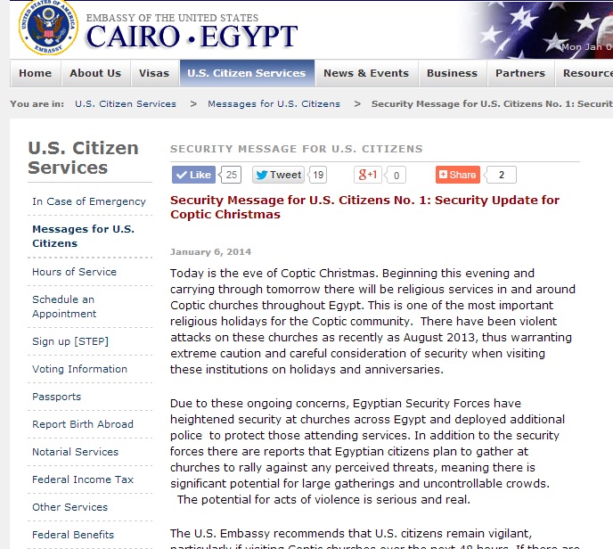 وقالت السفارة:''اليوم هو عيد الميلاد لطائفة الأقباط ابتداء من هذا المساء وحتى الغد، وستقام الشعائر الدينية في الكنائس القبطية والمناطق المجاورة لها، وعلى الرعايا الأمريكان في مصر الحذر الشديد ودراسة الأحوال الأمنية".
