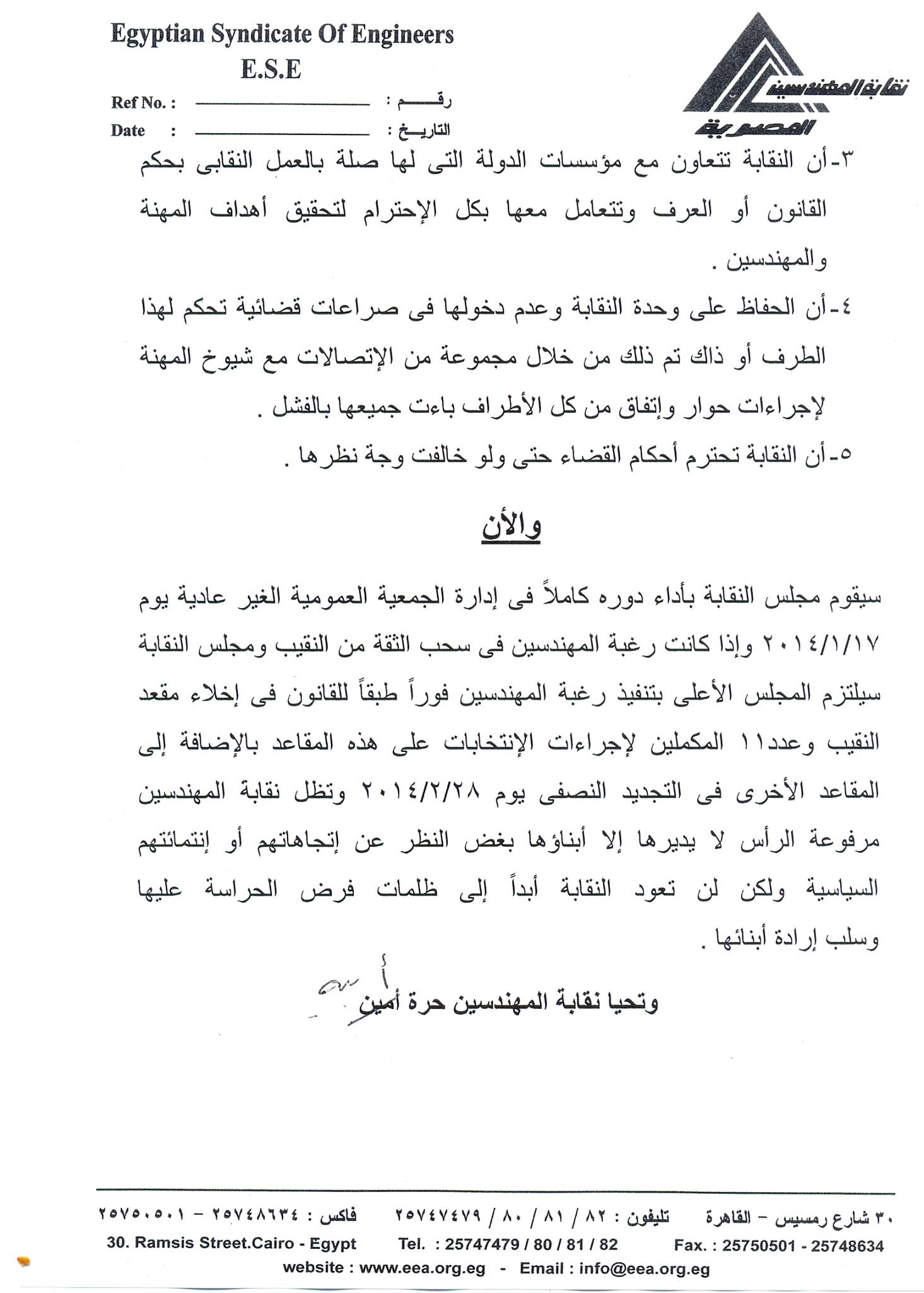 أصدر ماجد خلوصى نقيب المهندسين بيانا فى المؤتمر الصحفى الذى عقد ظهر اليوم بمقر النقابة العامة بالقاهرة حول الجمعية العمومية غير العاديه 17/1/2017 التى دعا إليها وزير الرى فى حكومة الإنقلاب ، أوضح فيه موقف النقابة من تلك الجمعية العمومية .
