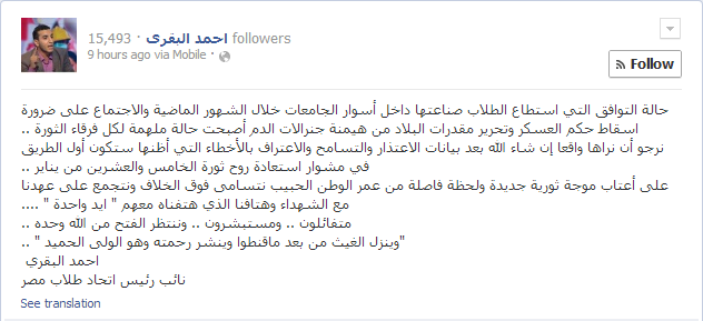 أشاد أحمد البقري نائب رئيس اتحاد طلاب مصر، بحالة التوافق التي استطاع الطلاب صناعتها داخل أسوار الجامعات خلال الشهور الماضية "والاجتماع على ضرورة اسقاط حكم العسكر وتحرير مقدرات البلاد من هيمنة جنرالات الدم أصبحت حالة ملهمة لكل فرقاء الثورة".