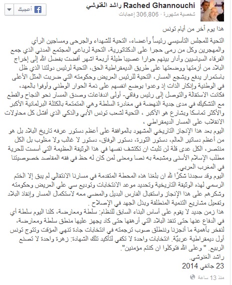 وقال رئيس حركة النهضة،فى تصريح له عبر صفحته الشخصية على موقع التواصل الاجتماعى "فيس بوك" " : " إن المصادقة على الدستور الجديد من قبل المجلس التأسيسي إنجاز تاريخي مشهود، خاصة أن هذا الدستور أعظم دستور عرفه تاريخ البلاد، قبل أن يستدرك بالقول "بل هو من أعظم دساتير العالم".