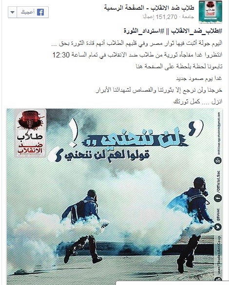 وقالت الحركة فى بيان لها عبر موقع التواصل الاجتماعى "فيس بوك" أن أمس السبت كان جولة أثبت فيها ثوار مصر وفي قلبهم الطلاب أنهم قادة الثورة بحق ،وغدا يوم صمود جديد ،خرجنا ولن نرجع إلا بثورتنا والقصاص لشهدائنا الأبرار".