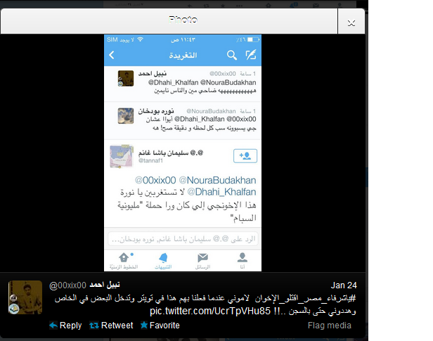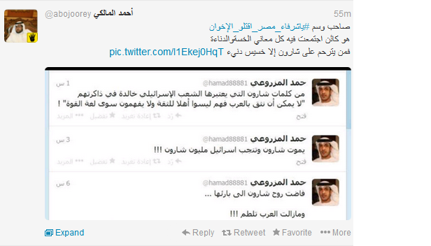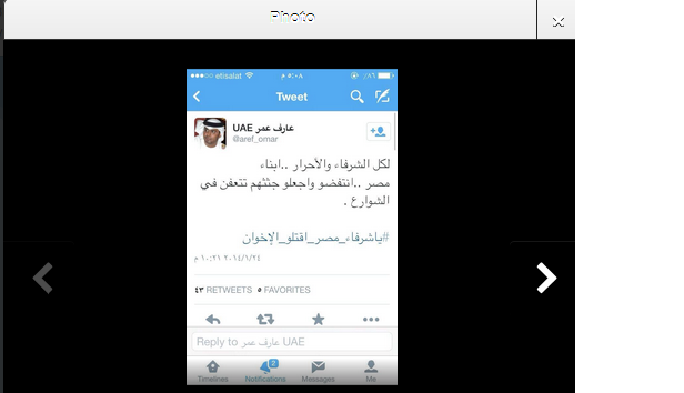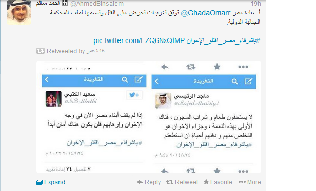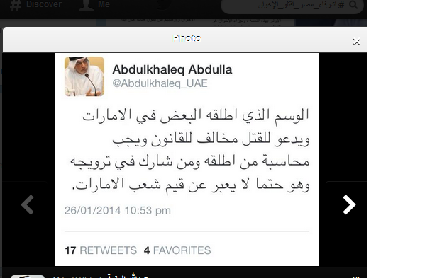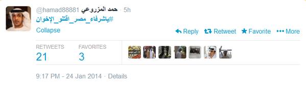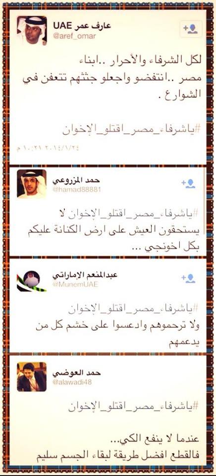 وفي تطور جديد أطلق عدد من الكتاب الإماراتيون علي موقع التواصل الاجتماعي تويتر هاشتاج جديد بعنوان " يا شرفاء مصر اقتلوا الإخوان" أطلقه الكاتب الاماراتي حمد المزروعي داعيا المصريين إلي قتل كل إخواني في مصر والإمارات قائلا : ‘نهم لا يستحقون العيش بمصر واستمر في تحريضه الذي لاقي قبولا من عدد من الاماراتيين علي رأسهم قائد شرطة دبي السابق ضاحى خلفان الذي برز وقت حكم الرئيس مرسي بسخريته من الرئيس وجماعة الاخوان وأيد الهاشتاج .