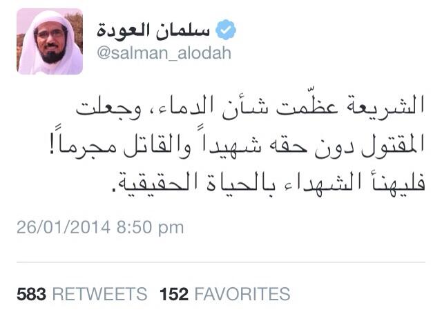 أما الداعية الاسلامي السعودي سلمان العودة فيرى أن الشريعة عظمت شأن الدماء وجعلت المقتول دون حقه شهيدا والقاتل مجرما فليهنأ الشهداء بالحياة الحقيقية.