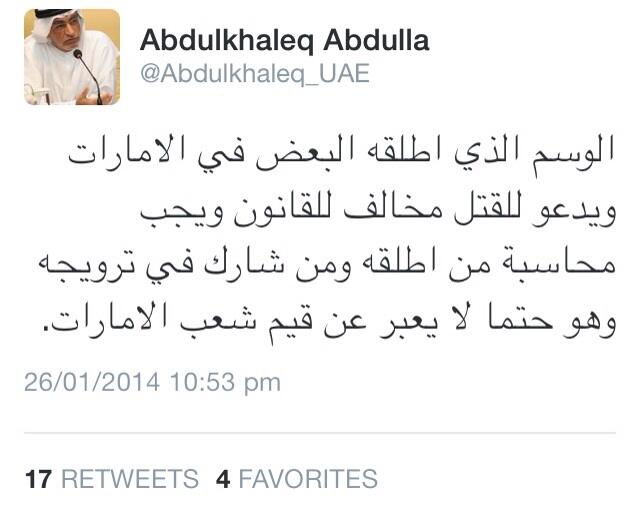 وقال الناشط عبد الخالق عبدالله أن الوسم الذي أطلقه البعض في الامارات ويدعو للقتل مخالف للقانون ويجب محاسبة من أطلقه ومن شارك في ترويجه وهو بالتأكيد لا يعبر عن حقيقة شعب الامارات ،وأيده في ذلك مدير تحرير صحيفة العرب القطرية عبدالله العذبة.