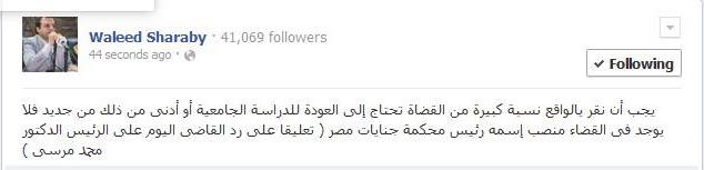وأضاف شرابي عبر حسابه الشخصي على موقع التواصل الإجتماعي "فيس بوك" لا يوجد فى القضاء منصب إسمه رئيس محكمة جنايات مصر ( تعليقا على رد القاضى اليوم على الرئيس الدكتور محمد مرسى ) .