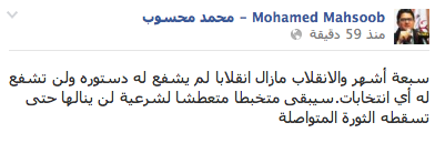 وأضاف محسوب عبر حسابه الشخصي على موقع التواصل الإجتماعي "فيس بوك" : "سيبقى الانقلاب متخبطا متعطشا لشرعية لن ينالها حتى تسقطه الثورة المتواصلة".