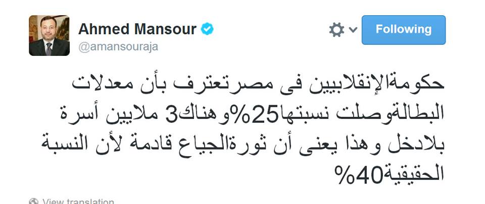 قال الإعلامي أحمد منصور إن اعتراف حكومة الإنقلابيين في مصر بأن معدلات البطالة وصلت نسبتها ٢٥٪ وهناك ٣ ملايين أسرة بلا دخل يعنى أن ثورة الجياع قادمة .