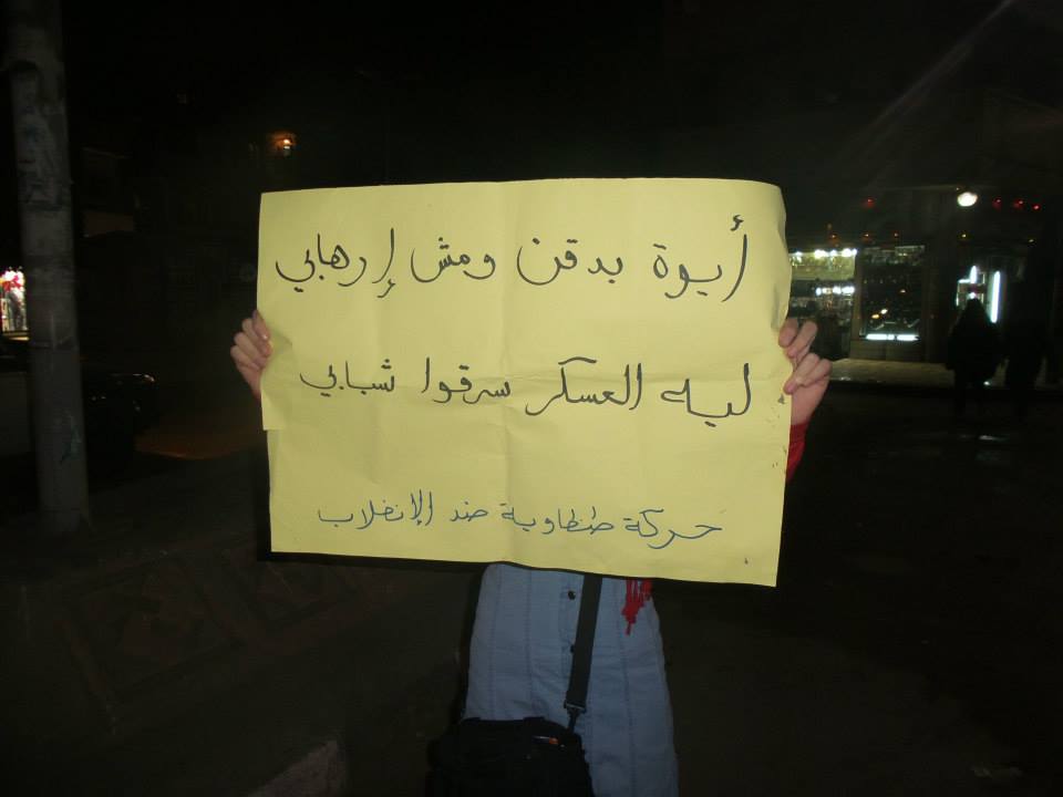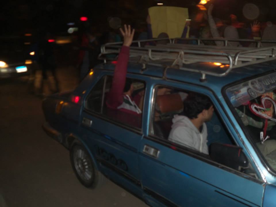 ورفعوا لافتات تندد بحكم العسكر, وشارات رابعة العدوية، وسط تفاعل كبير من المارة والأهالي؛ الذين لوحوا لهم بعلامات رابعة.