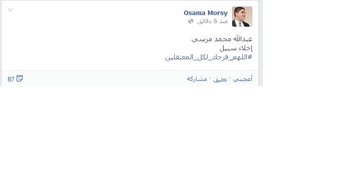 وأضاف أسامه عبر حسابه الشخصى على "فيس بوك" :" عبدالله محمد مرسي إخلاء سبيل اللهم فرجك لكل المعتقلين".