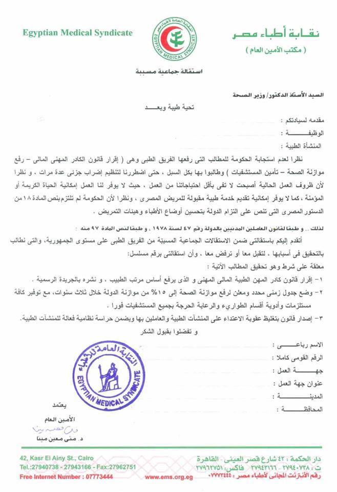 أقرت النقابة العامة للأطباء الصياغة النهائية لنص الاستقالة المسببة، لتقديمها لوزارة الصحة بحكومة الانقلاب في حالة عدم الاستجابة لمطالبها، وذلك عندما يصل عدد المستقيلون إلى عدد كبير .