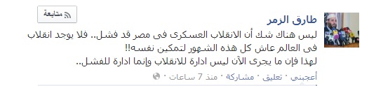 وقال عبر حسابه الرسمي على موقع التواصل الاجتماعي فيس بوك : "ليس هناك شك أن الانقلاب العسكري في مصر قد فشل.. فلا يوجد انقلاب في العالم عاش كل هذه الشهور لتمكين نفسه!! لهذا فإن ما يجرى الآن ليس إدارة للانقلاب وإنما إدارة للفشل".