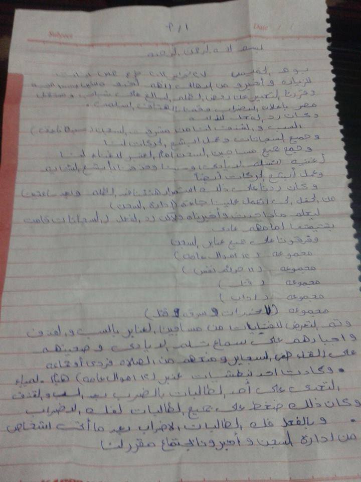 نشرت الصفحة الرسمية لطلاب ضد الانقلاب نص رسالة من الطالبات المعتقلات فى سجون الانقلاب والمحبوسات الآن فى سجن القناطر.