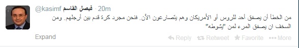 وقال – عبر حسابه الرسمى على تويتر – :"من الخطأ أن يصفق أحد للروس أو الأمريكان وهم يتصارعون الآن. فنحن مجرد كرة قدم بين أرجلهم. ومن السخف ان يصفق المرء لمن "يشوطه"