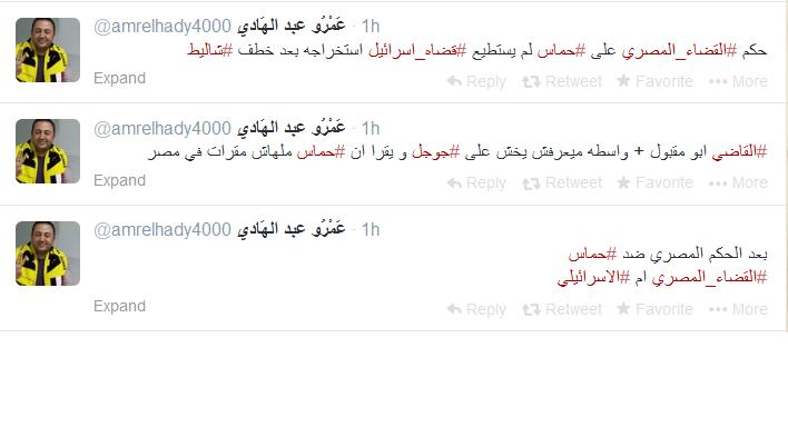 وقال عبد الهادى عبر حسابه الشخصي على تويتر – :" القاضي أبو مقبول + واسطة ميعرفش يخش على جوجل و يقرا إن حماس ملهاش مقرات في مصر" .