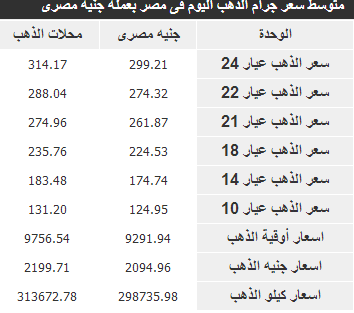 والجدول التالى يبين أسعار الذهب بالجنيه المصري