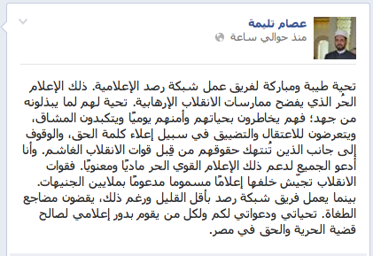 وقارن تليمة بين أداء الإعلام المصري وإمكاناته، وبين أداء وإمكانات "رصد" قائلا: "قوات الانقلاب تجيّش خلفها إعلامًا مسموما مدعومًا بملايين الجنيهات. بينما يعمل فريق شبكة رصد بأقل القليل ورغم ذلك، يقضون مضاجع الطغاة. تحياتي ودعواتي لكم، ولكل من يقوم بدور إعلامي لصالح قضية الحرية والحق في مصر".